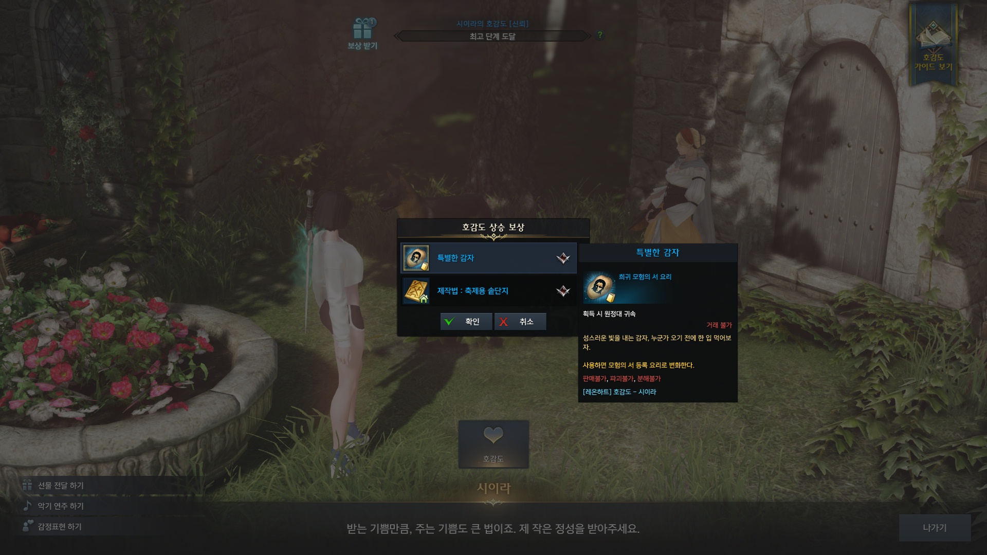시이라의 호감도를 신뢰등급으로 올리게되면 신뢰등급의 보상으로 특별한 감자를 받을수있습니다.